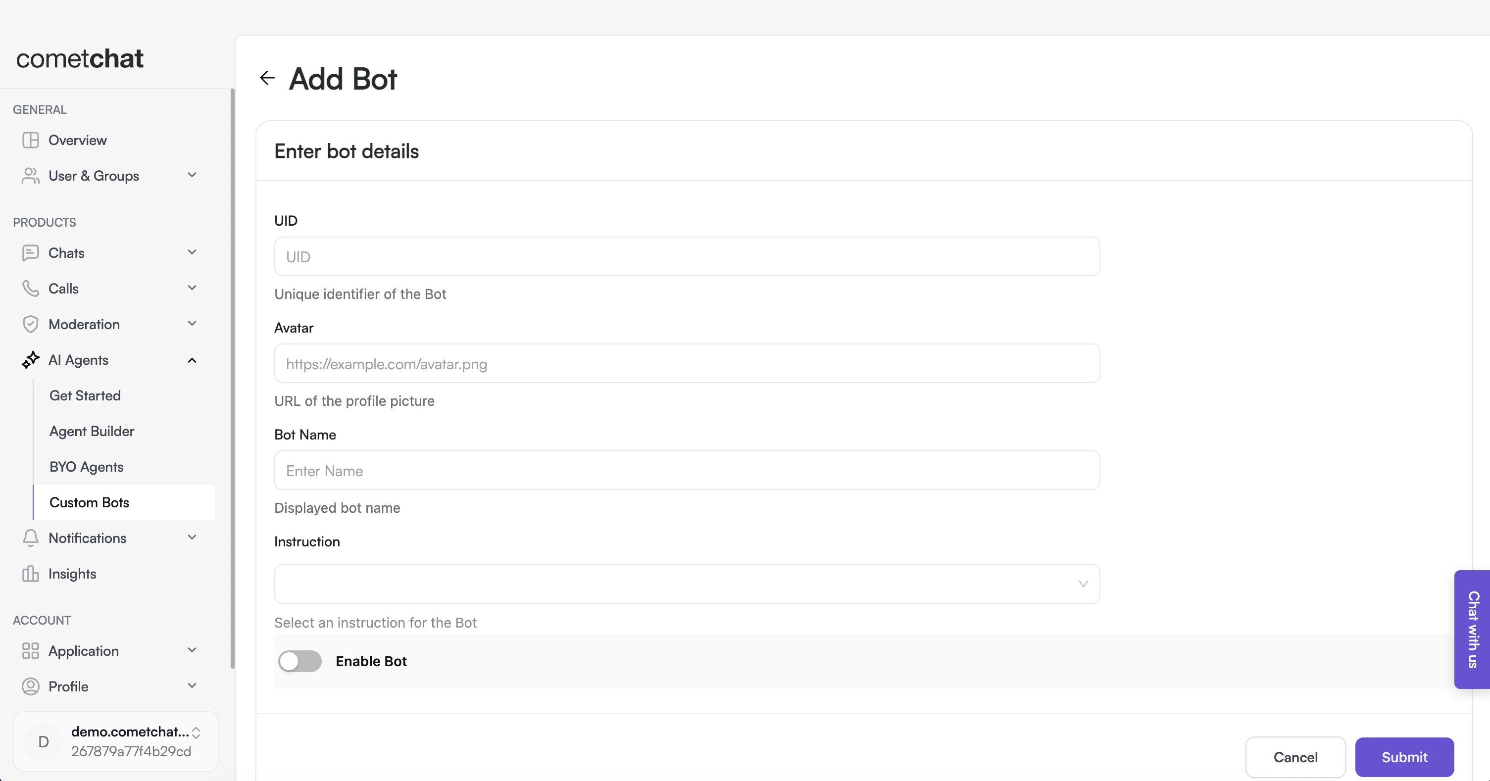 - Navigate to AI Agents > Custom Bots > AI Bots in the left-hand menu.