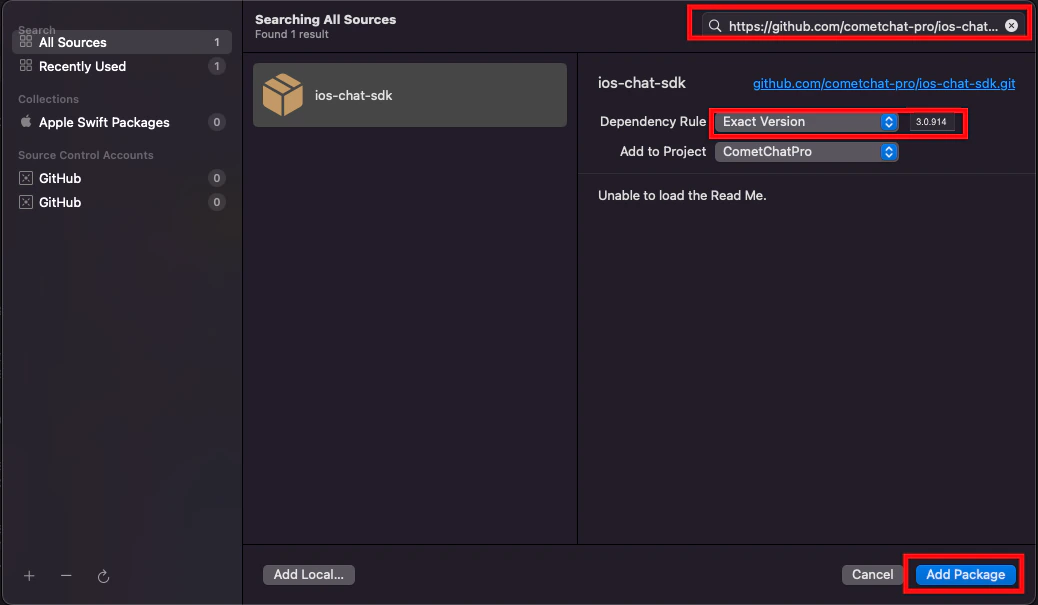 https://github.com/cometchat/chat-sdk-ios.gitand set dependency rule toUp to Next Major Versionand set version as3.0.919. Then click on the Add Package button.