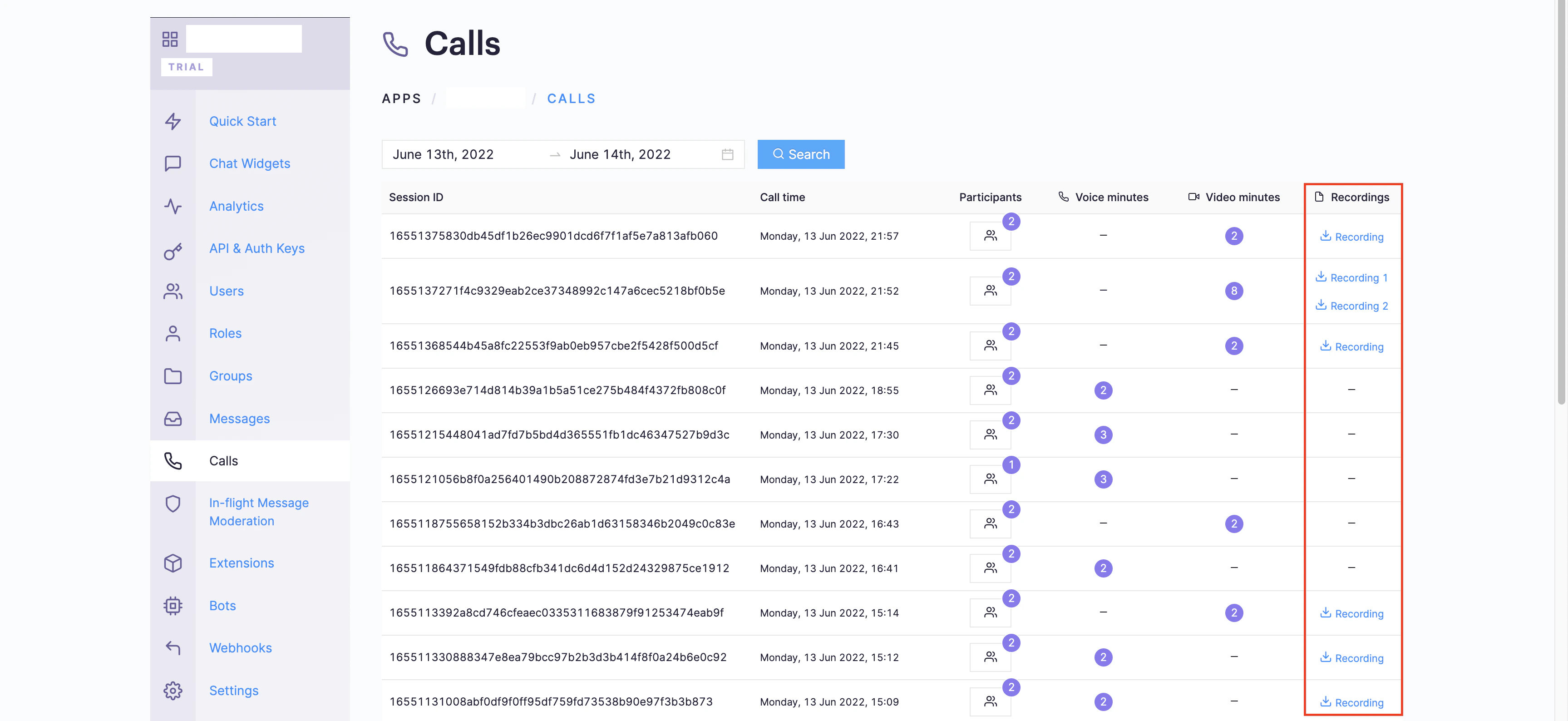 Currently, the call recordings are available on the CometChat Dashboard under the Calls Section. You can refer to the below screenshot.