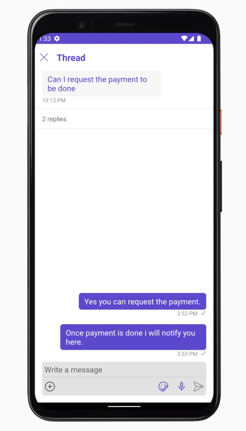 Filters allow you to customize the data displayed in a list within a Component. You can filter the list based on your specific criteria, allowing for a more customized. Filters can be applied using RequestBuilders of Chat SDK. ThreadedMessages does not have its own Filters. However, you can filter the messages list in ThreadedMessages Component using MessageListConfiguration. Example In this example, we are filtering messages based on the ParentMessageID and searching for messages that contain the keyword “payment”.- Java