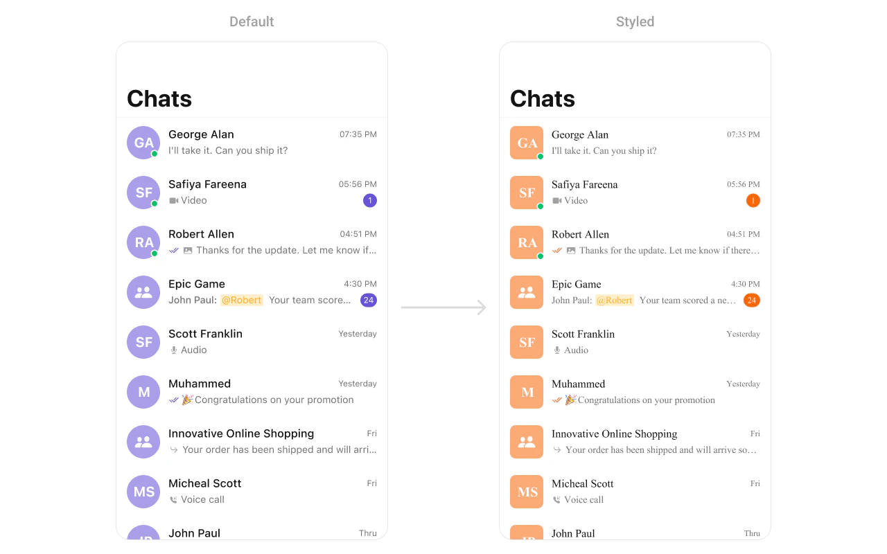 The CometChatConversations component provides a list of recent chats, displaying participants, message previews, and timestamps. It supports default themes while offering extensive customization for text appearance, icons, and layout. This component allows you to create an intuitive and visually appealing chat list that matches your app’s branding. You can check out the list of styling properties offered by CometChatConversations