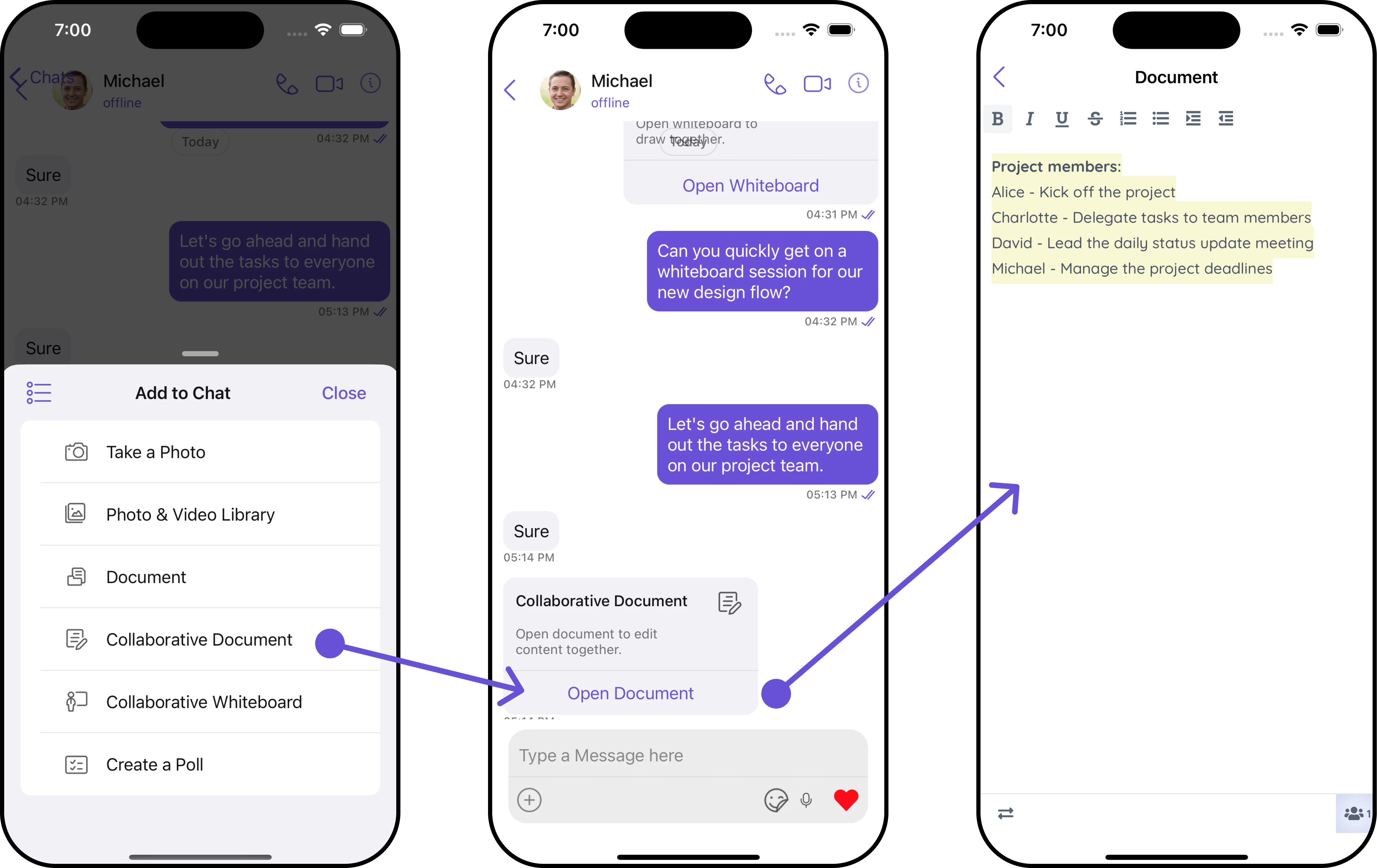 With the Collaborative Document extension, users can work together on a shared document. This feature is essential for remote teams where document collaboration is a recurring requirement. For a comprehensive understanding and guide on implementing and using the Collaborative Document Extension, refer to our specific guide on the Collaborative Document Extension. Once you have successfully activated the Collaborative Document Extension from your CometChat Dashboard, the feature will automatically be incorporated into the Action Sheet of the Message Composer component of UI Kits.