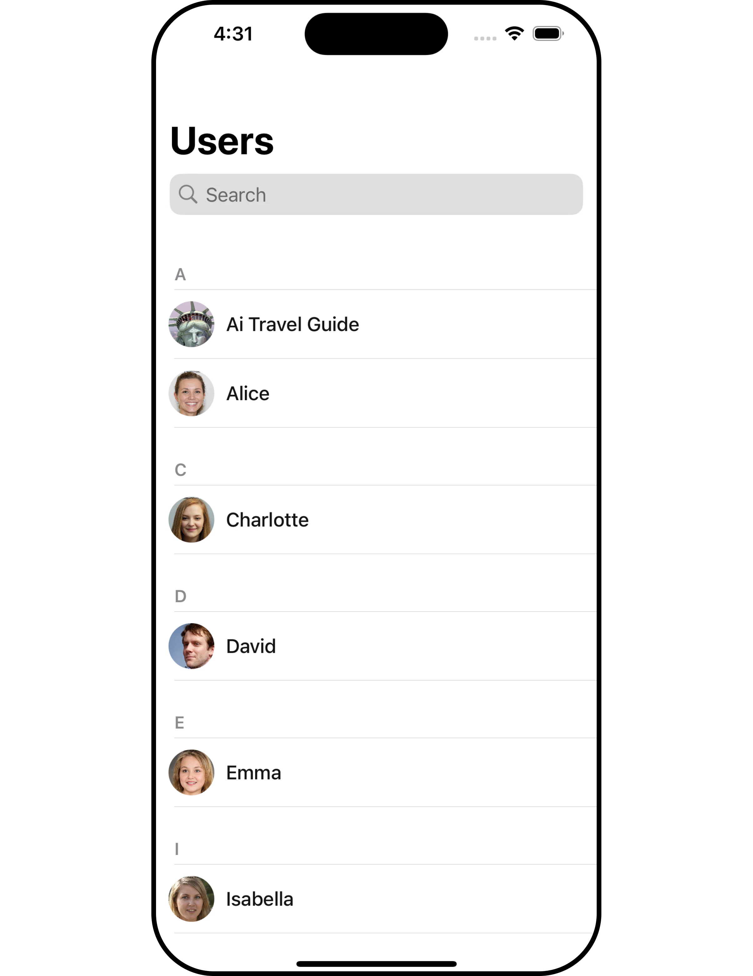 The SearchRequestBuilder uses UserRequestBuilder enables you to filter and customize the search list based on available parameters in UserRequestBuilder. This feature allows you to keep uniformity between the displayed UserList and searched UserList. Example In the example below, we are applying a filter to the UserList based on Search.- Swift