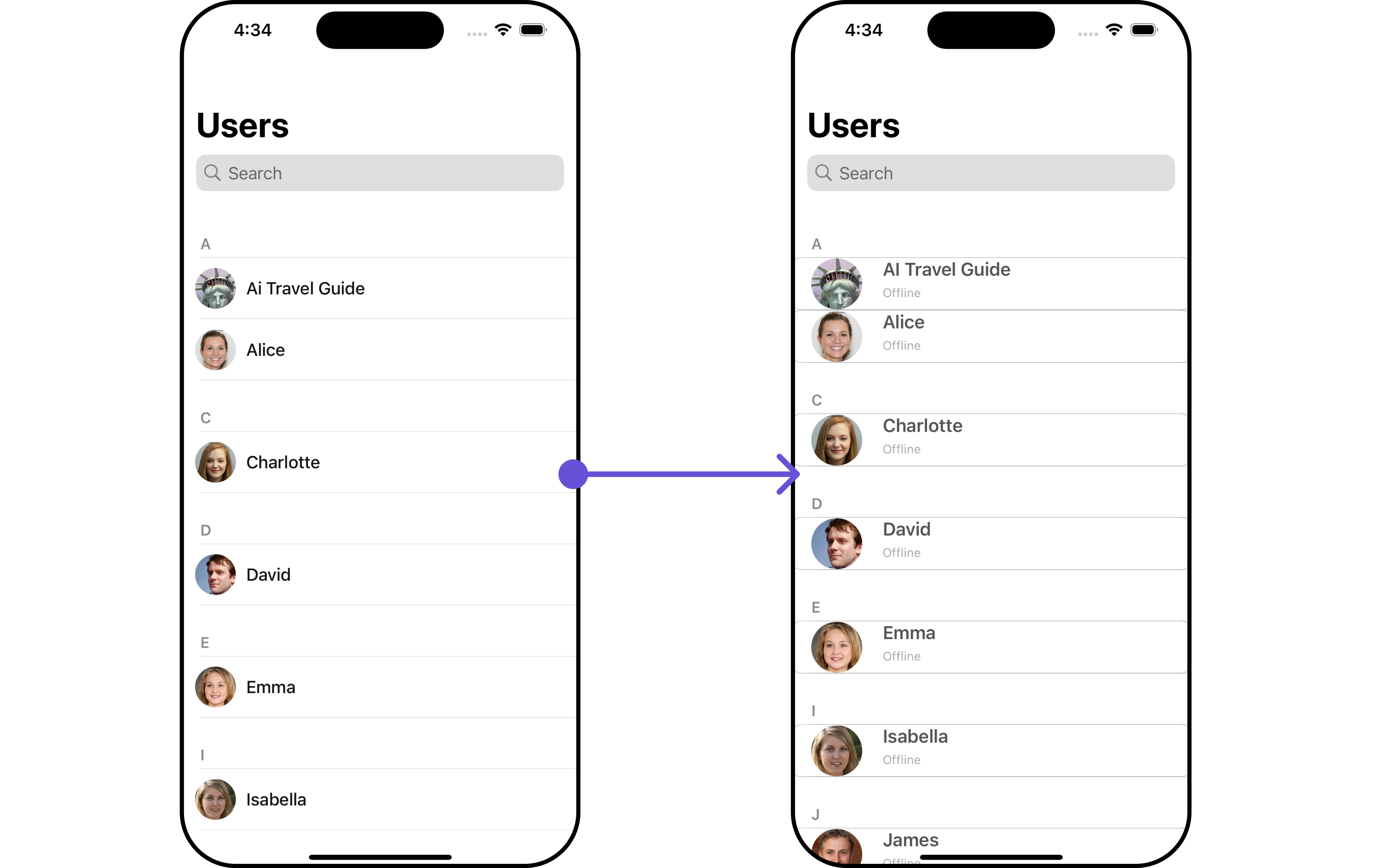 AsCometChatUsers is a custom view controller, it can be launched directly by user actions such as button clicks or other interactions. It’s also possible to integrate it into a tab view controller. CometChatUsers offers several parameters and methods for UI customization.