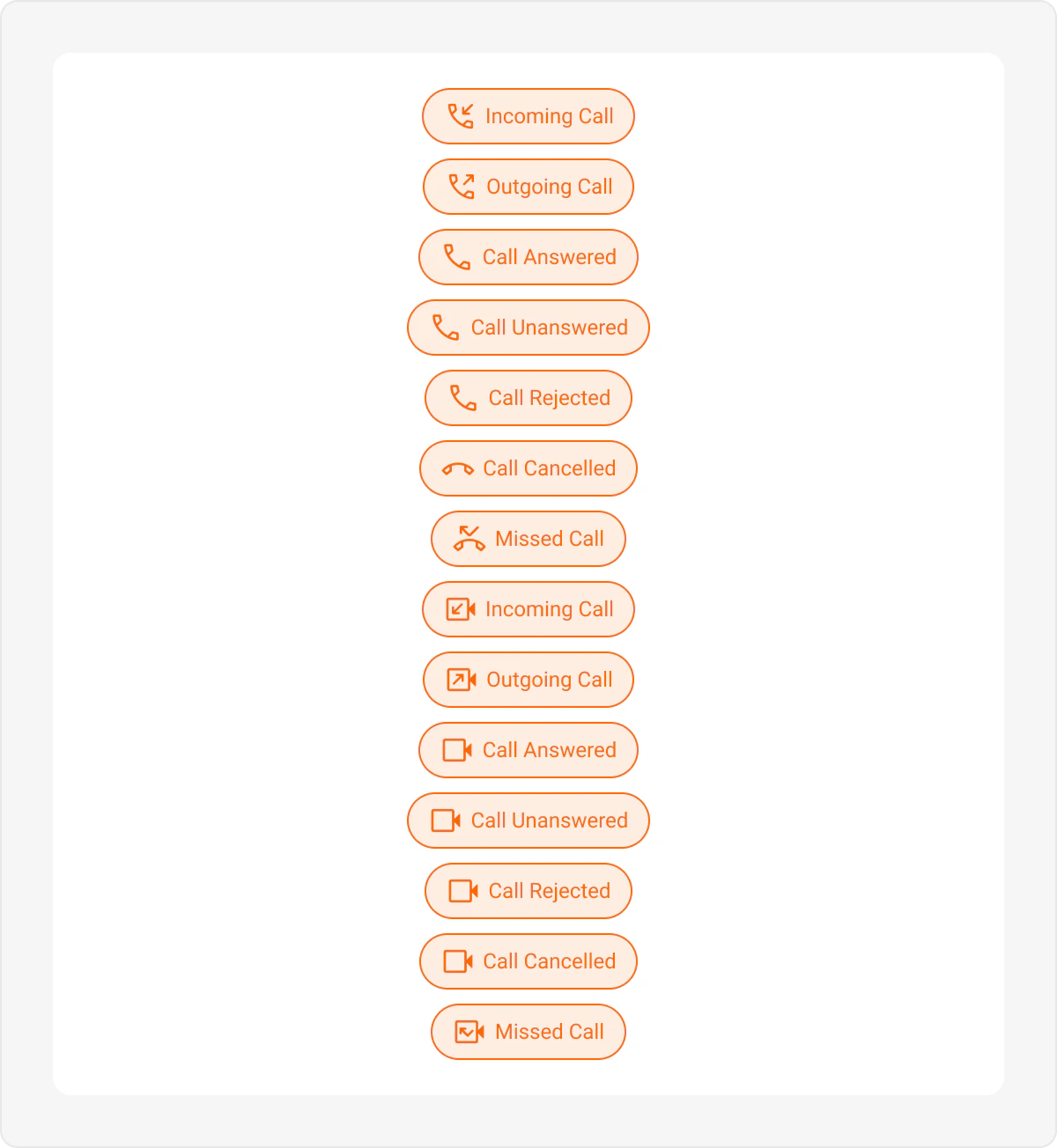 Call action bubbles display call-related actions, such as missed calls, in the chat interface. Default