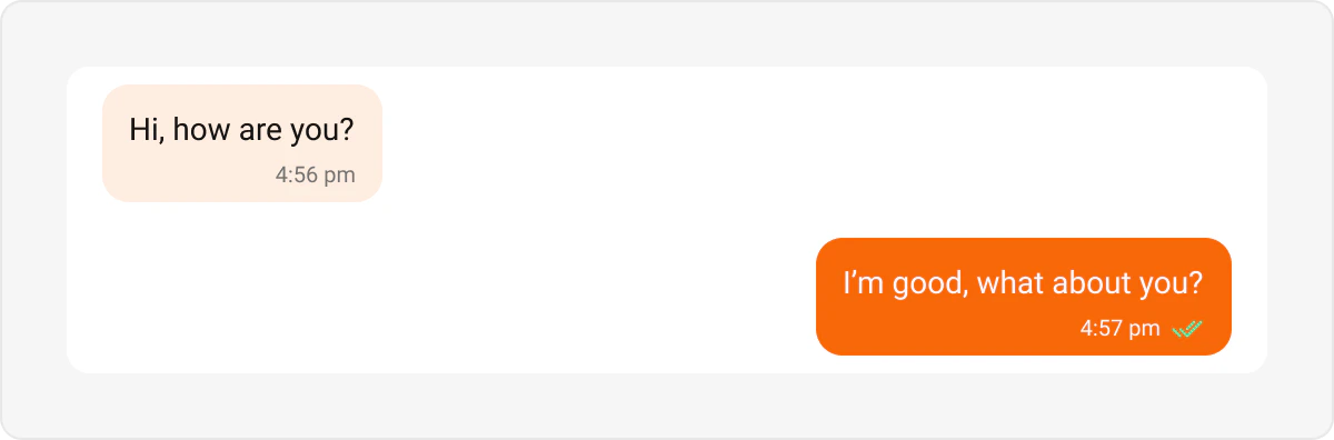 Message bubbles are core elements of the messaging interface. Their collective appearance can be customized to create a consistent design, including color, shape, and overall style for both outgoing and incoming messages. The message bubbles’ styles can be customized by extending the predefined styles in your theme. Customizing Incoming Message Bubble