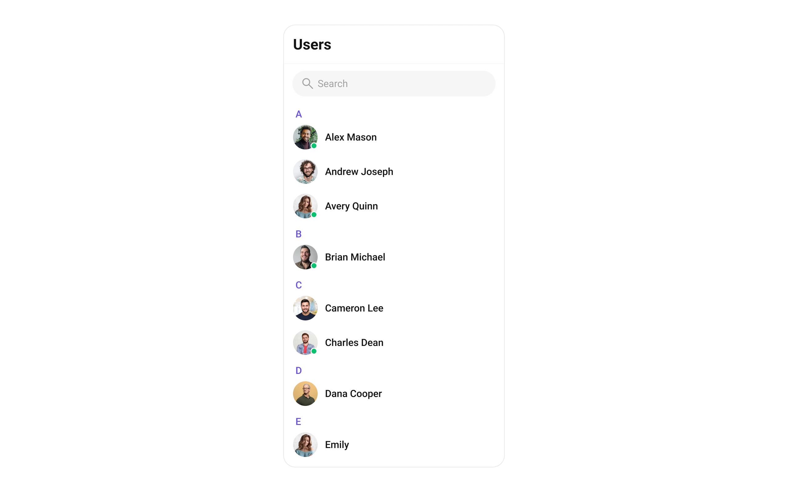 | Search by keyword | new CometChat.UsersRequestBuilder().setSearchKeyword("alice") |