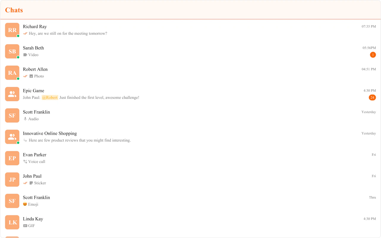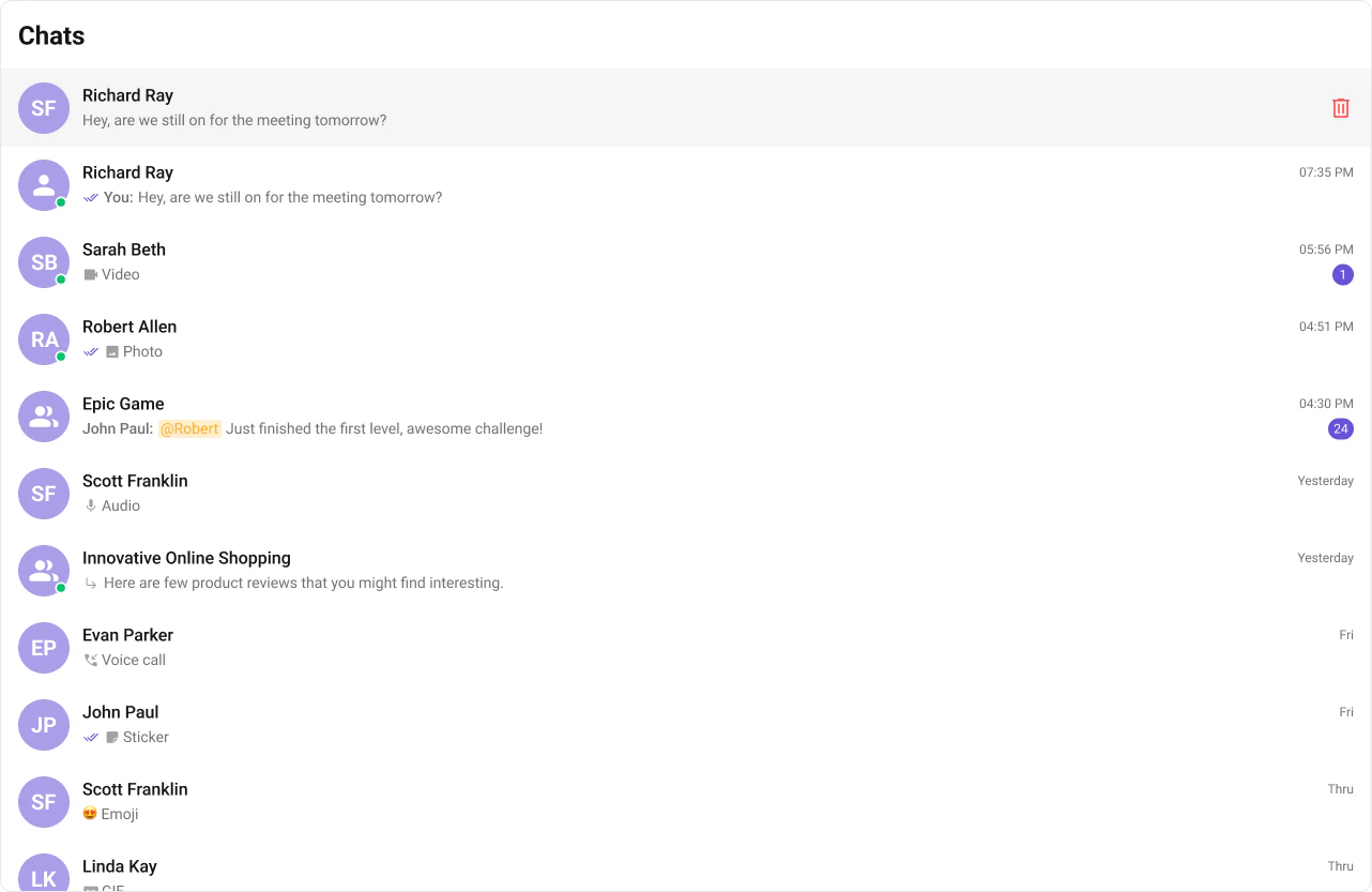 onTextMessageReceived / onMediaMessageReceived / onCustomMessageReceived | Moves conversation to top, updates last message preview and unread count |