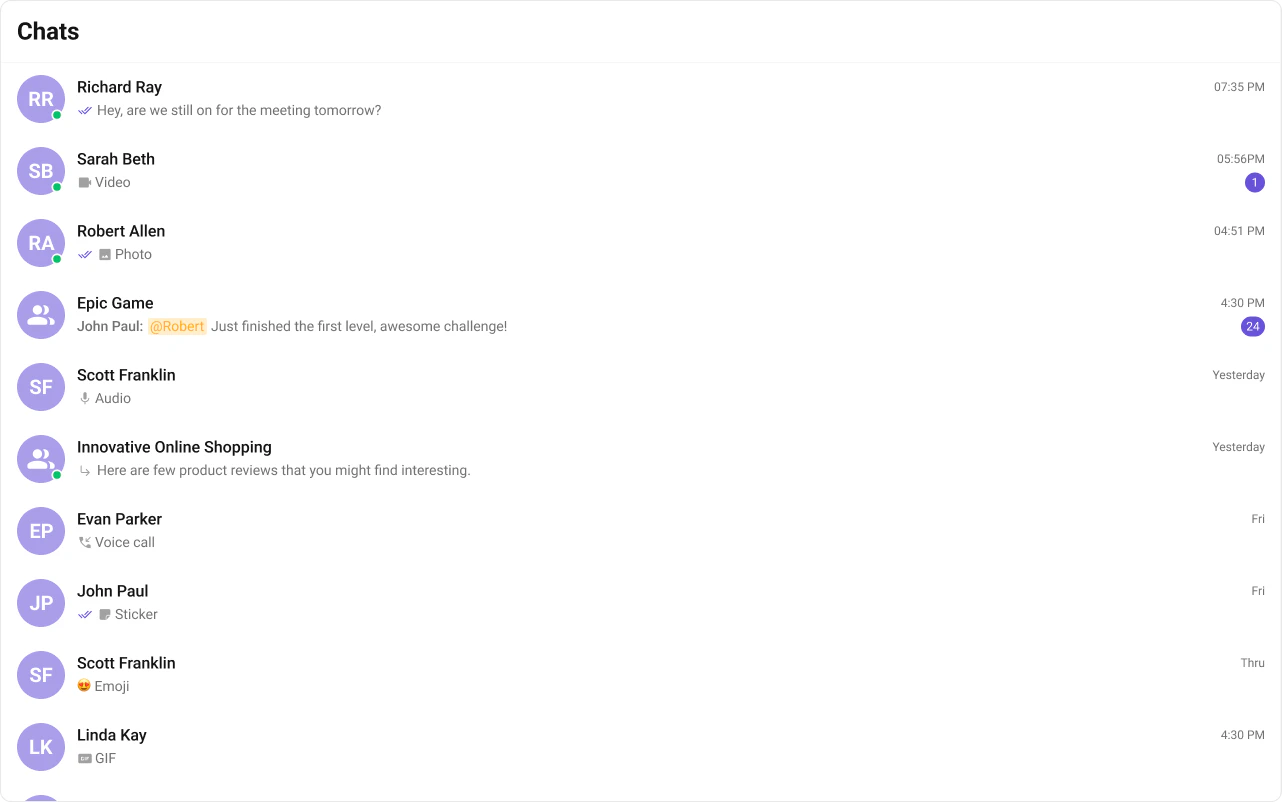 onUserOnline / onUserOffline | Updates online/offline status dot (unless hideUserStatus={true}) |