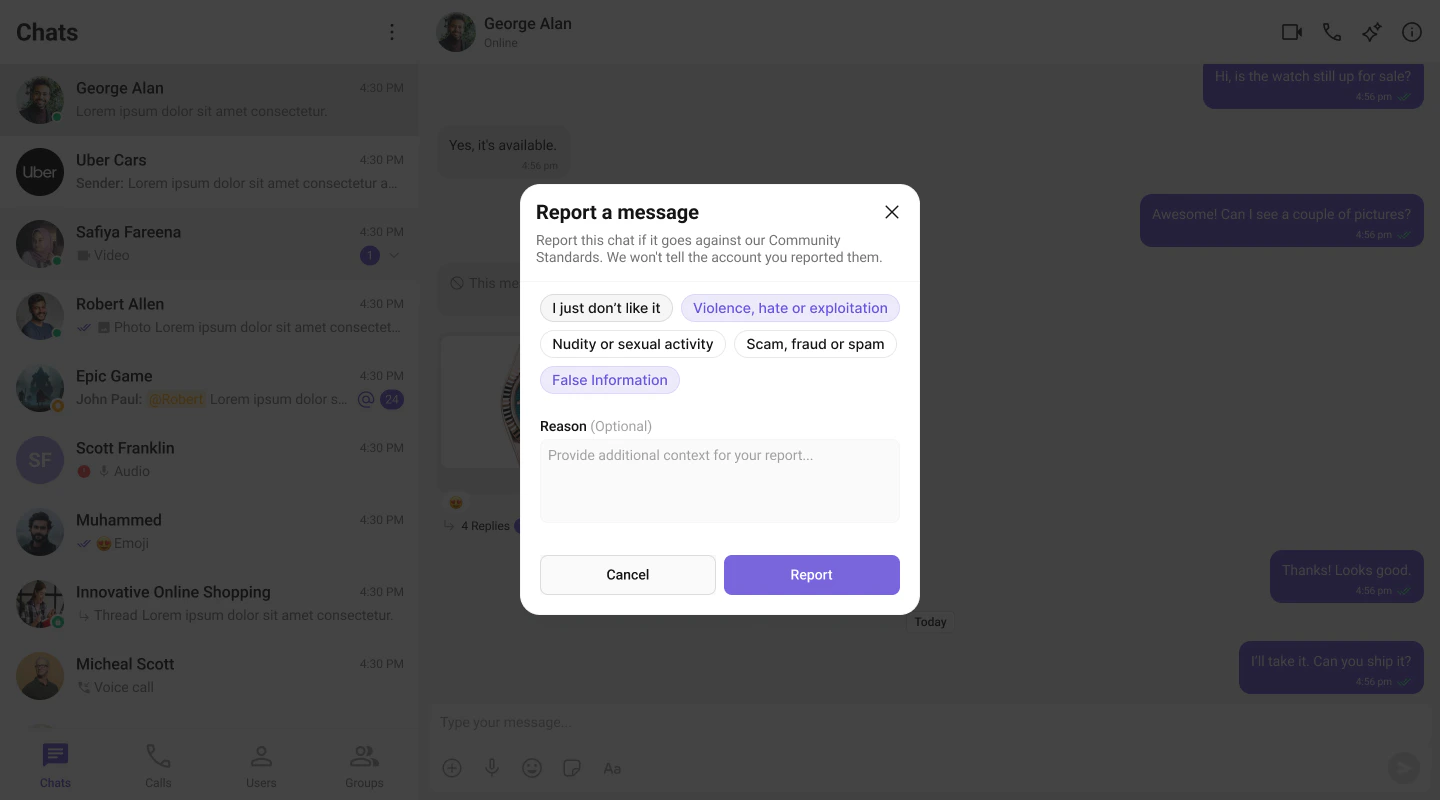 The Report Message feature allows users to report inappropriate or harmful messages within the chat. Users can choose from predefined reasons and provide additional remarks for detailed context. This feature helps maintain a safe and respectful chat environment.Learn more about how flagged messages are handled, reviewed, and moderated in the Flagged Messages documentation.