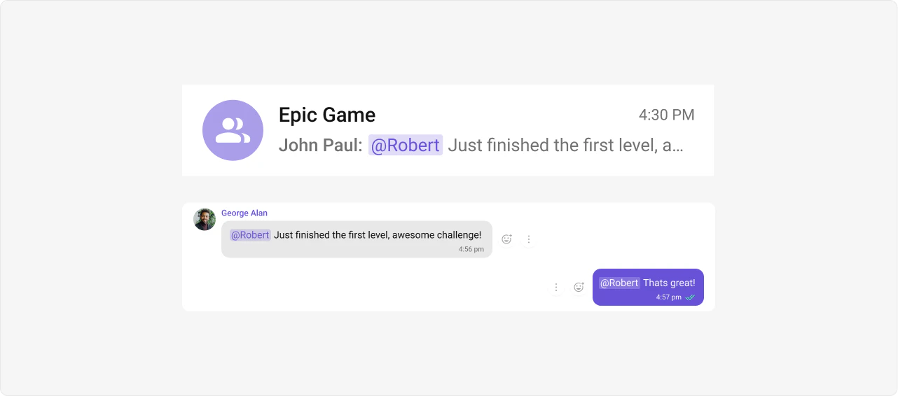 Mentions is a robust feature provided by CometChat that enhances the interactivity and clarity of group or 1-1 chats by allowing users to directly address or refer to specific individuals in a conversation. The feature also supports group mentions like @all, enabling users to quickly notify all members in a group chat simultaneously.