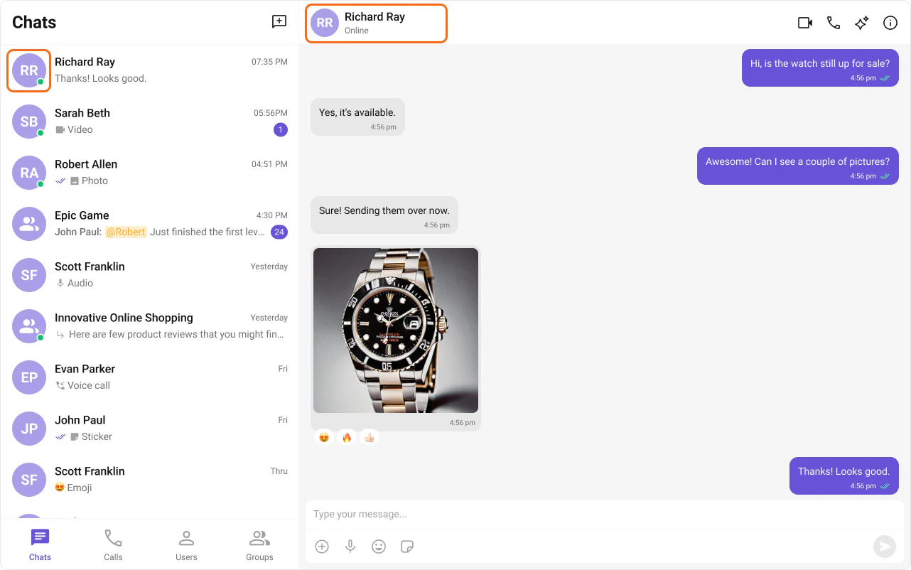CometChat’s User Presence feature allows users to see whether their contacts are online, offline. This helps users know the best time to initiate a conversation and sets expectations about response times.