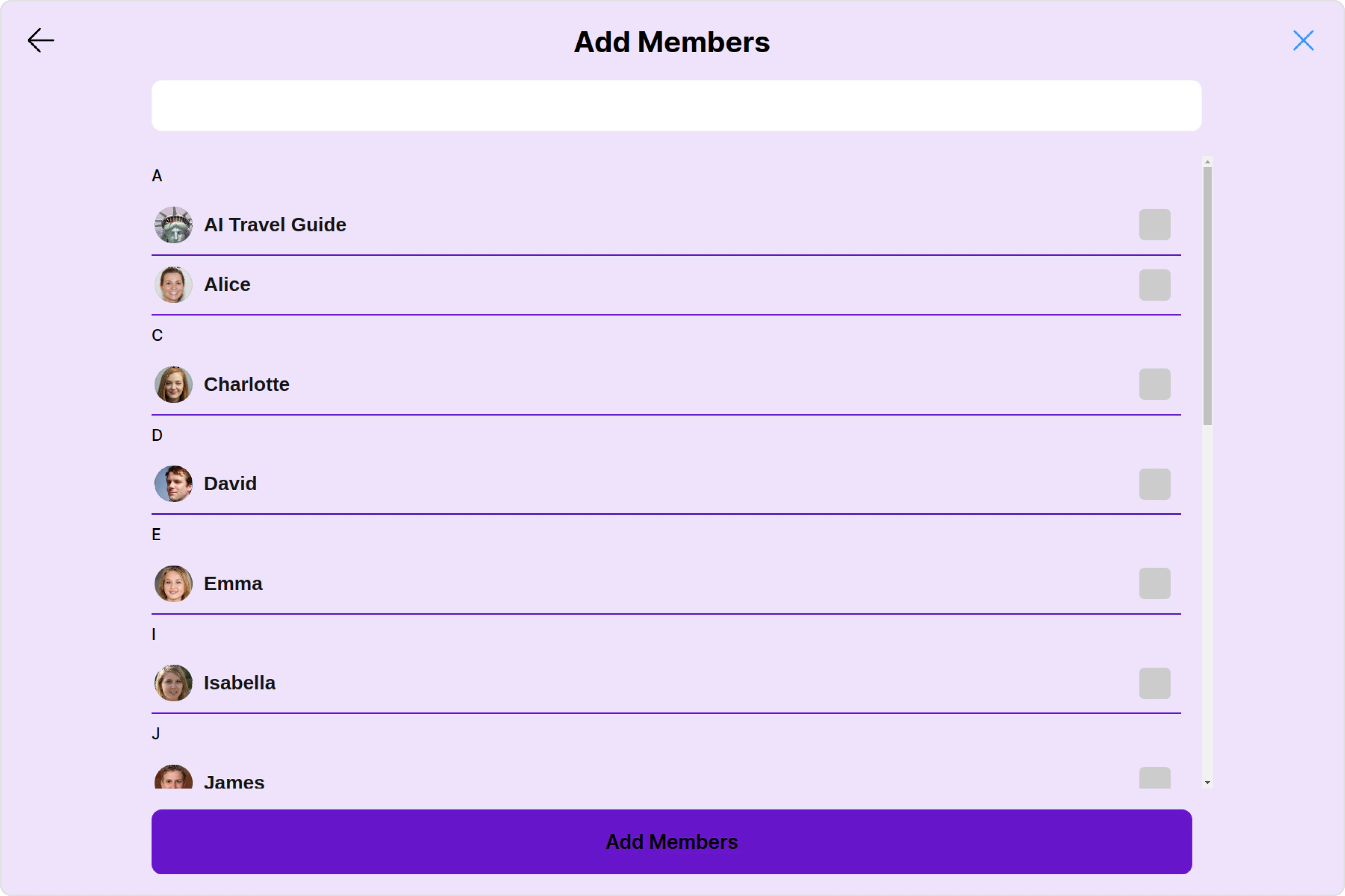 You can customize the properties of the Add Members component by making use of the AddMembersConfiguration. You can accomplish this by employing the addMembersConfiguration props as demonstrated below: